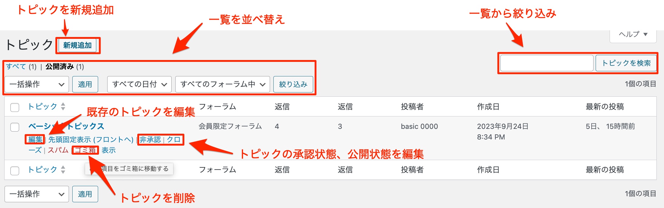 トピック一覧から削除したいトピックのタイトル下の【ゴミ箱ー移動】をクリックしてトピックを削除することができます。