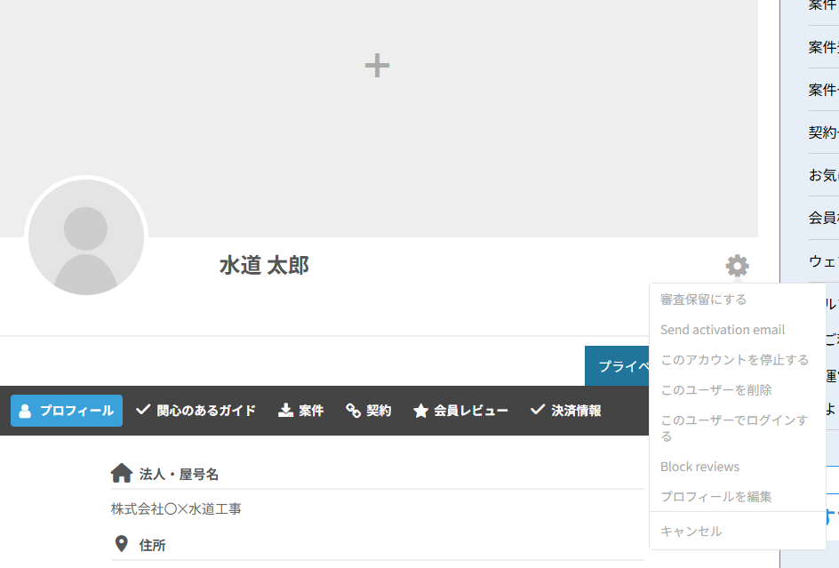 会員詳細ページでギアアイコンをクリックすると、そのユーザーに対するアカウント操作のメニューが開きます。